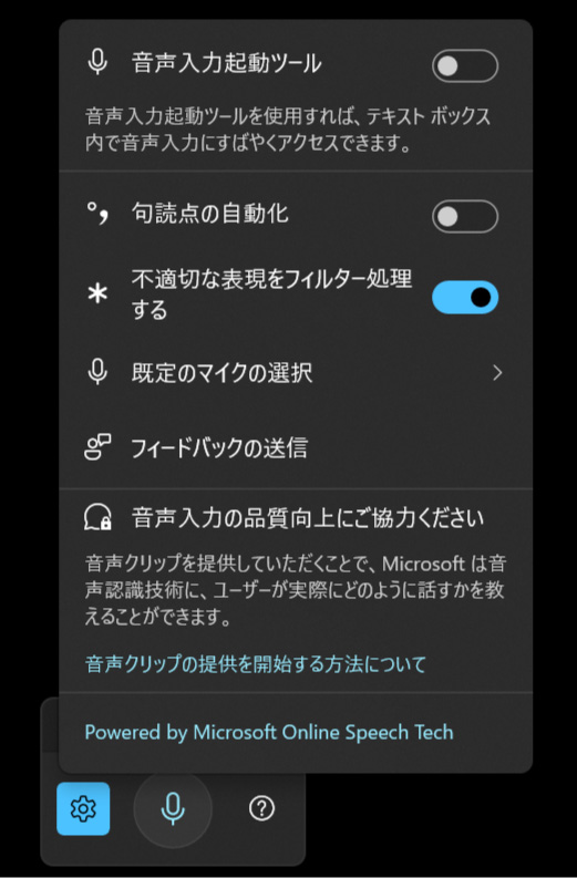 音声入力の設定について。ショートカットキーで起動したら左の歯車マークを押しましょう。